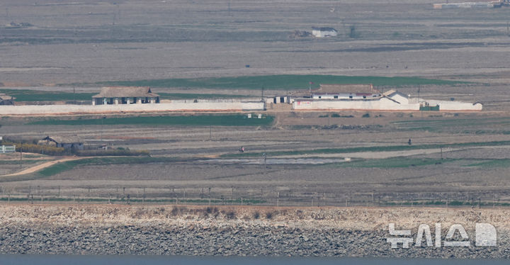 [인천=뉴시스] 전진환 기자 = 김일성 북한 주석 생일(태양절)인 15일 인천 강화군 강화평화전망대에서 바라본 북한 황해북도 개풍군의 한 마을 인근에서 북한 주민들이 논두렁을 걸어가고 있다. 2026.04.15. [email protected]