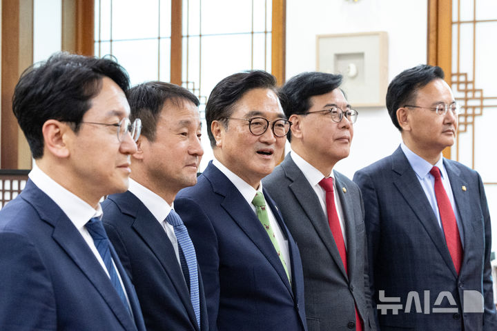 [서울=뉴시스] 조성봉 기자=우원식 국회의장이 15일 서울 여의도 국회 집무실에서 여야 원내대표단과 기념촬영에 앞서 인사말하고 있다. 왼쪽부터 천준호 더불어민주당 원내운영수석부대표, 한병도 원내대표, 우 국회의장, 송언석 국민의힘 원내대표, 유상범 원내운영수석부대표. (공동취재) 2026.04.15. [email protected]