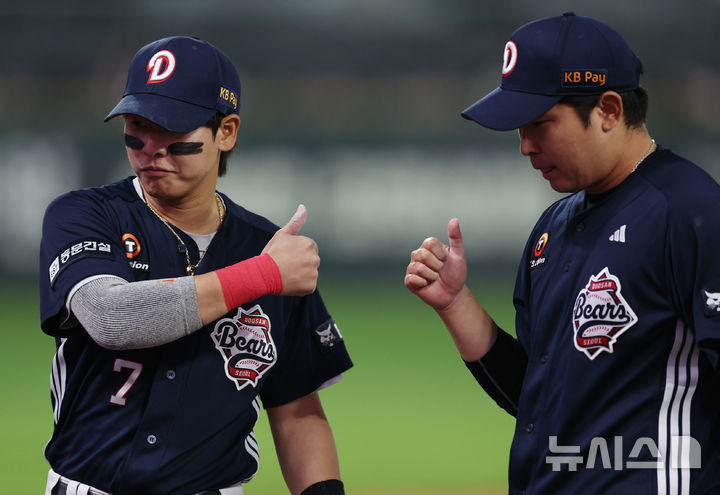 [인천=뉴시스] 최진석 기자 = 15일 인천 SSG랜더스필드에서 열린 2026 KBO리그 두산 베어스와 SSG 랜더스의 경기, 4회말을 무실점으로 끝낸 뒤 두산 유격수 박찬호가 투수 김정우와 기뻐하고 있다. 2026.04.15 [email protected]
