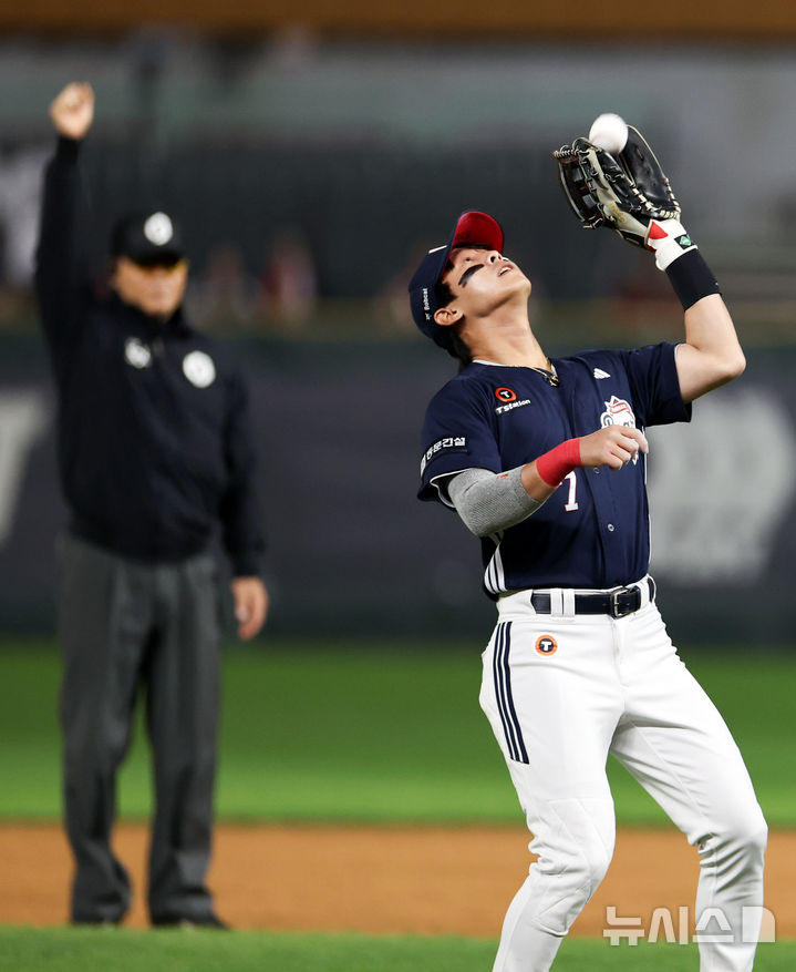 [인천=뉴시스] 최진석 기자 = 15일 인천 SSG랜더스필드에서 열린 2026 KBO리그 두산 베어스와 SSG 랜더스의 경기, 4회말 1사 만루 상황 두산 유격수 박찬호가 SSG 에레디아의 내야 뜬공을 잡아내고 있다. 2026.04.15 [email protected]