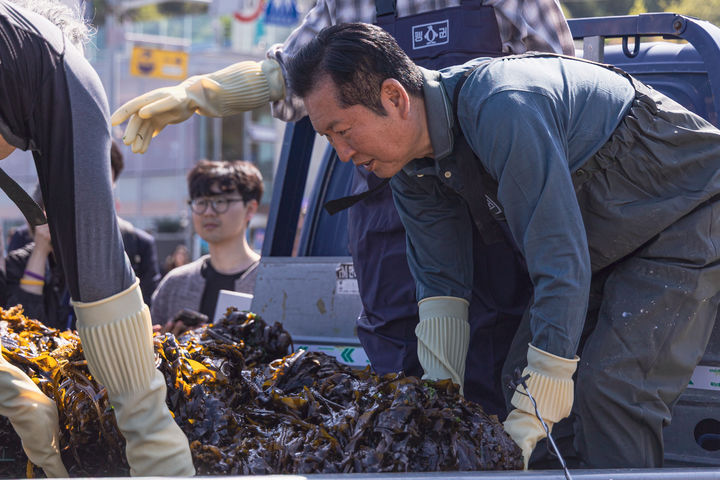 [서울=뉴시스] 조성봉 기자 = 정청래 더불어민주당 대표가 15일 오후 부산 기장군 해조류 건조 작업장에서 현장 체험을 하고 있다.(사진=더불어민주당 제공) 2026.04.15. [email protected]
