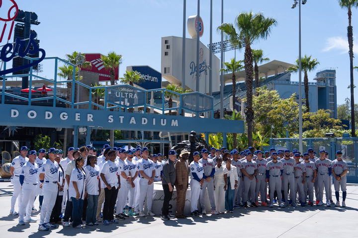 '재키 로빈슨 동상' 주변에 모인 다저스·메츠 선수들