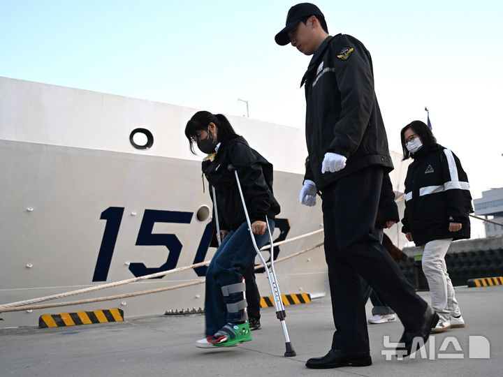 [목포=뉴시스] 이현행 기자 = 세월호 참사 12주기인 16일 오전 전남 목포시 해경 전용 부두에서 선상 추모식에 참여하는 세월호 유족들이 부두에 오르고 있다. 2026.04.16. [email protected]