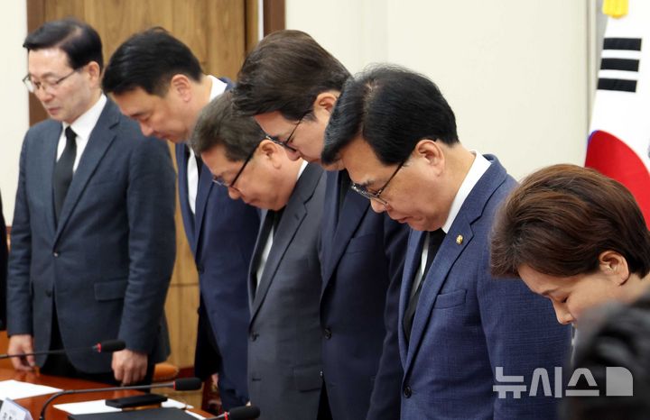 [서울=뉴시스] 조성봉 기자 = 송언석 국민의힘 원내대표와 최고위원들이 16일 오전 서울 여의도 국회에서 열린 최고위원회의에서 세월호 참사 희생자들의 12주기를 추모하며 묵념을 하고 있다. 2025.04.16. [email protected]