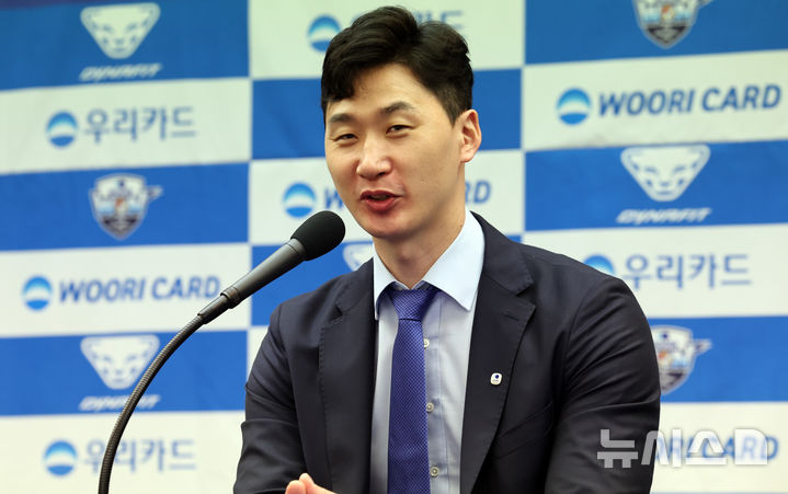 [서울=뉴시스] 최진석 기자 = 박철우 우리카드 배구단 신임 감독이 16일 서울 중구 한국프레스센터에서 열린 감독 취임 기자회견에서 기자들의 질문에 답하고 있다. 2026.04.16. [email protected]