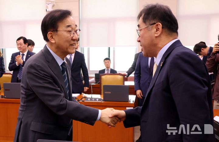 [서울=뉴시스] 조성봉 기자 = 김윤덕 국토교통부 장관이 16일 오전 서울 여의도 국회에서 열린 국토교통위원회 전체회의를 마치고 맹성규 국토교통위원장과 악수를 하고 있다. 2026.04.16. [email protected]