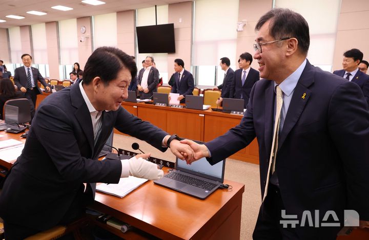 [서울=뉴시스] 조성봉 기자 = 맹성규 국회 국토교통위원장이 16일 오전 서울 여의도 국회에서 열린 국토교통위원회 전체회의를 마치고 권영진 국민의힘 의원과 악수를 하고 있다. 2026.04.16. [email protected]