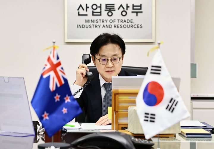 [서울=뉴시스] 김정관 산업통상부 장관이 16일 오후 서울 종로구 정부서울청사에서 시미언 브라운 뉴질랜드 에너지 장관과 통화를 하며 최근 중동 정세 및 에너지 공급망과 석유제품 협력 방안 등을 논의하고 있다. (사진=산업통상부 제공) 2026.04.16. [email protected] *재판매 및 DB 금지