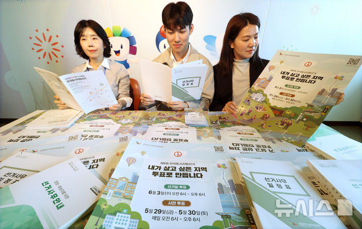 [인천=뉴시스] 전진환 기자 = 16일 오후 인천 미추홀구 인천시선거관리위원회에서 직원들이 제9회 전국동시지방선거 투표참여 홍보를 위한 포스터, 리플릿, 투표 절차 안내도 등을 확인하고 있다. 2026.04.16. [email protected]