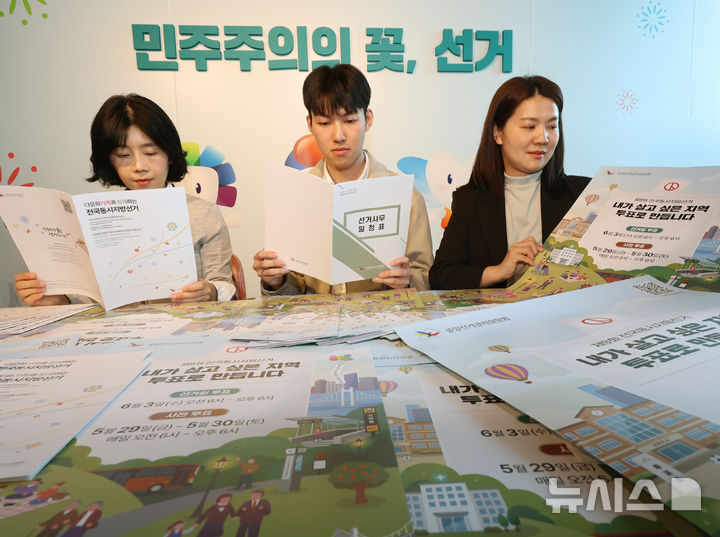 [인천=뉴시스] 전진환 기자 = 16일 오후 인천 미추홀구 인천시선거관리위원회에서 직원들이 제9회 전국동시지방선거 투표참여 홍보를 위한 포스터, 리플릿, 투표 절차 안내도 등을 확인하고 있다. 2026.04.16. [email protected]