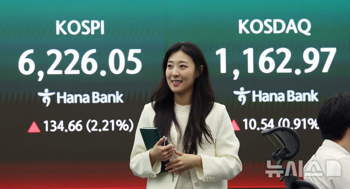 코스피는 전 거래일(6091.39)보다 134.66포인트(2.21%) 상승한 6226.05에, 코스닥 지수는 전 거래일(1152.43)보다 10.54포인트(0.91%) 오른 1162.97에 거래를 마쳤다. 2026.04.16. [email protected]