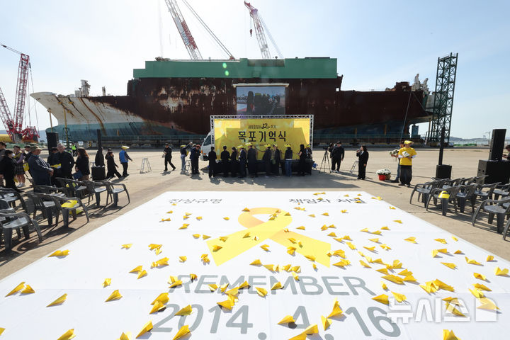 [목포=뉴시스]이영주 기자 = 세월호 참사 12주기인 16일 오후 전남 목포신항 세월호 선체 앞에서 세월호 참사 12주기 목포기억식이 열리고 있다. [email protected]