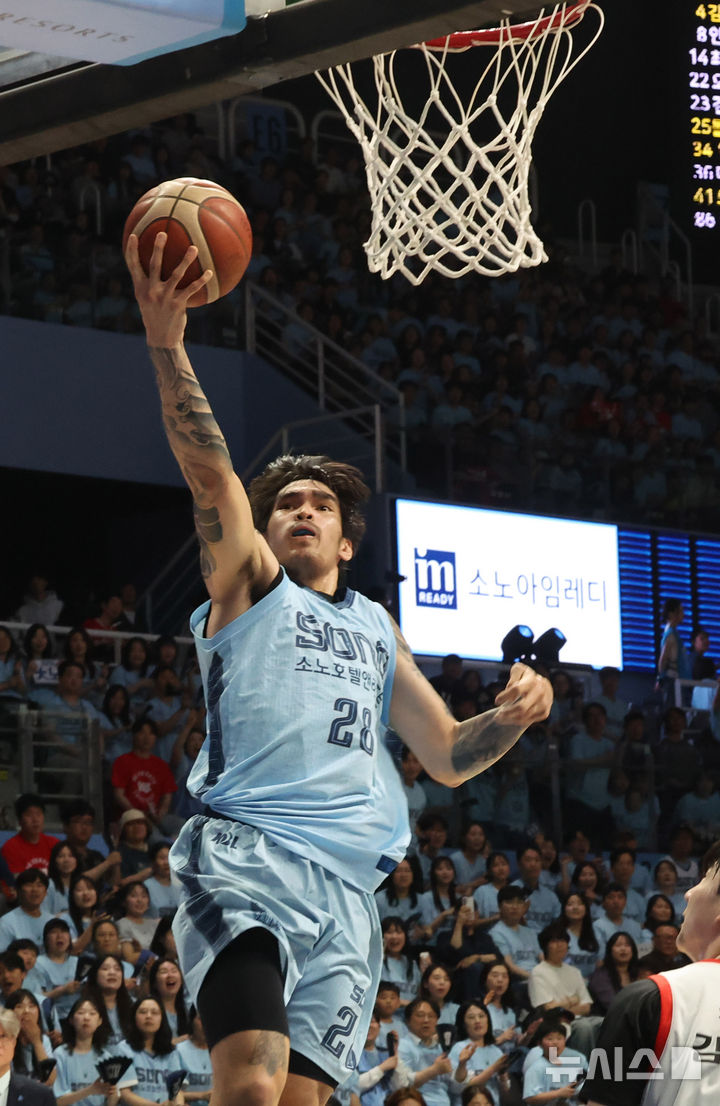 [고양=뉴시스] 배훈식 기자 = 16일 오후 경기 고양시 고양소노아레나에서 열린 2025~2026시즌 LG전자 프로농구 6강 플레이오프 고양 소노와 서울 SK의 3차전, 1쿼터 소노 켐바오가 레이업을 하고 있다. 2026.04.16. [email protected]
