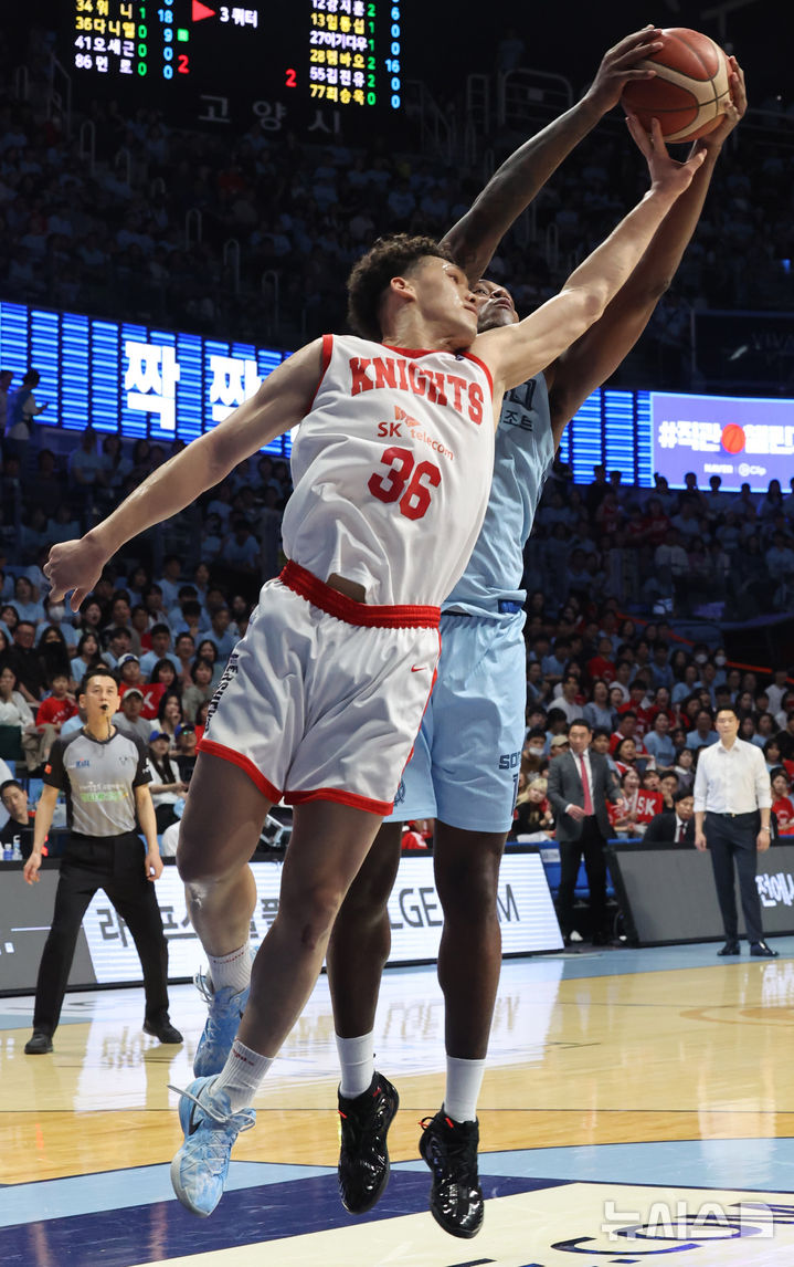 [고양=뉴시스] 배훈식 기자 = 16일 오후 경기 고양시 고양소노아레나에서 열린 2025~2026시즌 LG전자 프로농구 6강 플레이오프 고양 소노와 서울 SK의 3차전, 3쿼터 소노 나이트와 SK 다니엘이 리바운드 다툼을 하고 있다. 2026.04.16. [email protected]