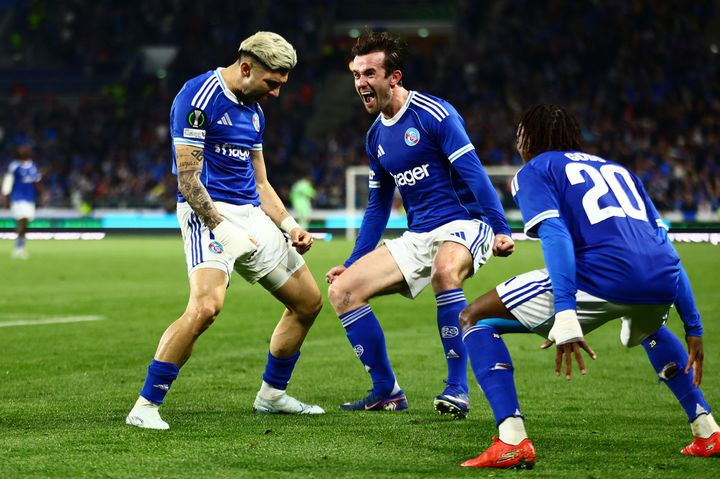 [스트라스부르=AP/뉴시스] 스트라스부르의 훌리오 엔시소(왼쪽)가 16일(현지 시간) 프랑스 스트라스부르의 스타드 드 라 메노에서 열린 2025-26 유럽축구연맹(UEFA) 콘퍼런스리그(UECL) 8강 2차전 마인츠(독일)와 경기 후반 24분 팀 3번째 골을 넣고 동료들과 환호하고 있다. 이재성이 부상으로 빠진 마인츠는 0-4로 패해 1,2차전 합계 2-4로 지면서 4강에 진출하지 못했다. 2026.04.17.