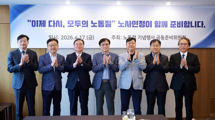 왼쪽부터 이정한 경제사회노동위원회 상임위원, 노광표 공공상생연대기금 이사장, 남용우 한국경영자총협회 상무, 권 차관, 류기섭 한국노동조합총연맹 사무총장, 송경용 한국노동재단 이사장, 박승흡 전태일재단 이사장. (사진=고용노동부 제공) 2026.04.17. [email protected] *재판매 및 DB 금지