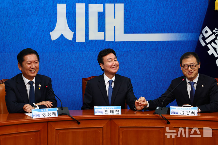 [서울=뉴시스] 김명년 기자 = 민주당 1호 영입인재인 전태진 변호사가 17일 서울 여의도 국회에서 열린 더불어민주당 인재영입식에서 김상욱 의원과 손을 잡고 있다. 있다. 전 변호사는 당 울산시장 예비후보로 출마하는 김상욱 의원의 지역구인 울산 남갑에 전략 공천될 전망이다. 2025.04.17. [email protected]