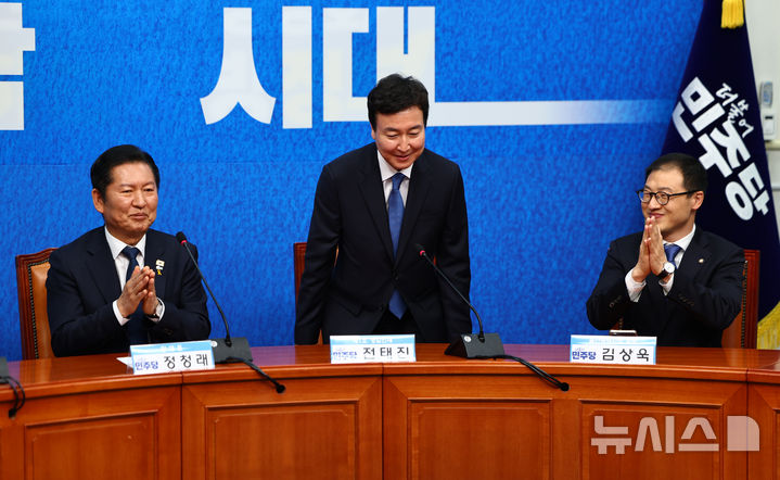 [서울=뉴시스] 김명년 기자 = 민주당 1호 영입인재인 전태진 변호사가 17일 서울 여의도 국회에서 열린 더불어민주당 인재영입식에서 인사하고 있다. 전 변호사는 당 울산시장 예비후보로 출마하는 김상욱 의원의 지역구인 울산 남갑에 전략 공천될 전망이다. 2025.04.17. [email protected]
