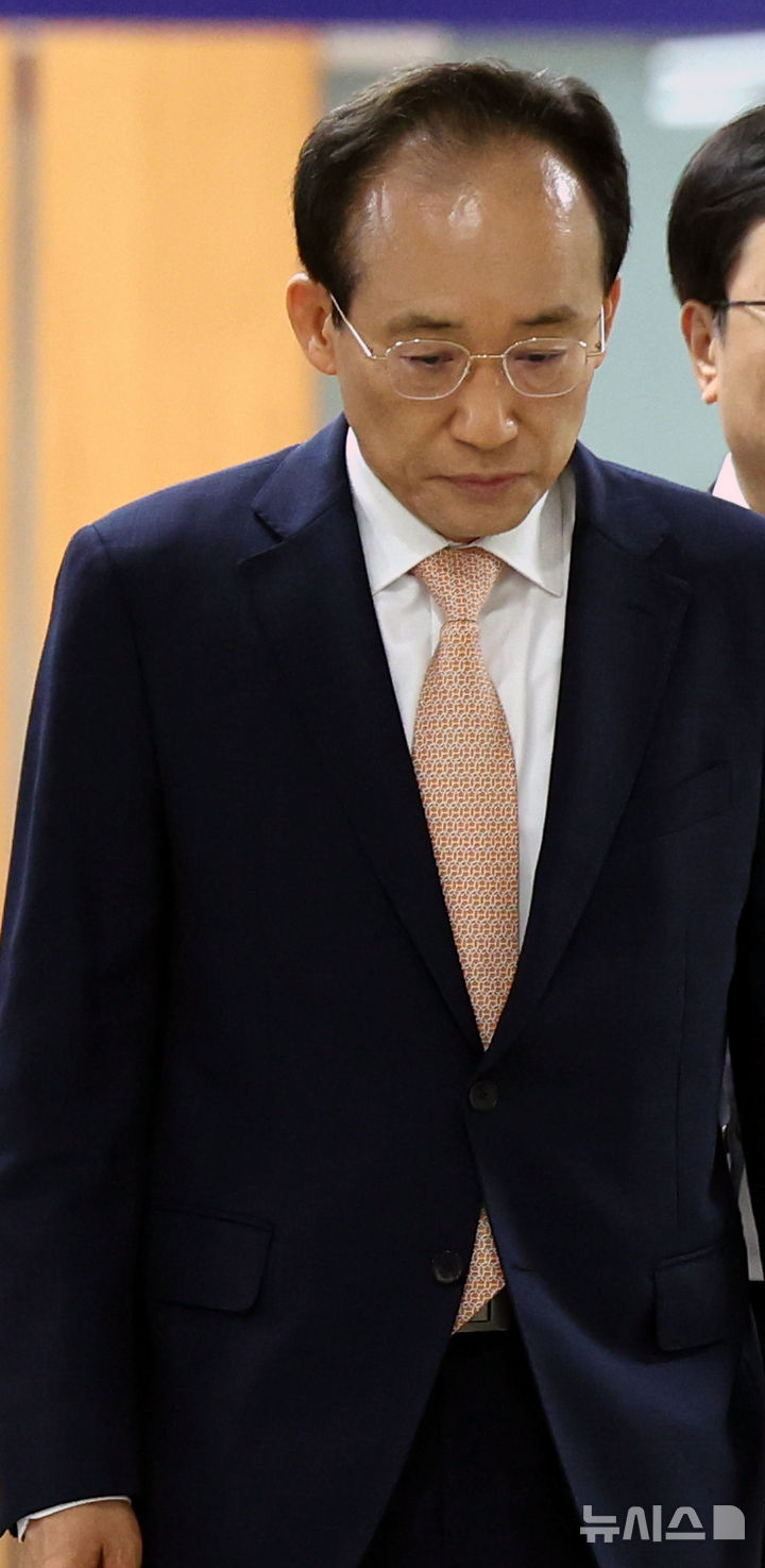 [서울=뉴시스] 박주성 기자 = 비상계엄 해제 의결을 방해한 혐의로 기소된 추경호 국민의힘 의원이 17일 오전 서울 서초구 서울중앙지방법원에서 열린 공판에 출석하고 있다. 2026.04.17. [email protected]
