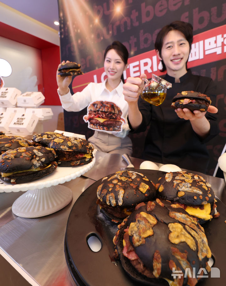 [서울=뉴시스] 조수정 기자 = 17일 오전 서울 용산구 롯데리아 숙대입구역점에서 모델들이 '삐딱한 천재'로 불리는 이찬양 셰프와 협업한 '번트 비프버거'를 소개하고 있다. 번트 비프버거는 그을린듯한 특이한 형상의 번트(burnt)치즈번과 함께 캐러멜 어니언과 깊은 육향의 순비프패티로 제품의 맛을 배가 시킨 독특한 제품이다. 2026.04.17. [email protected]