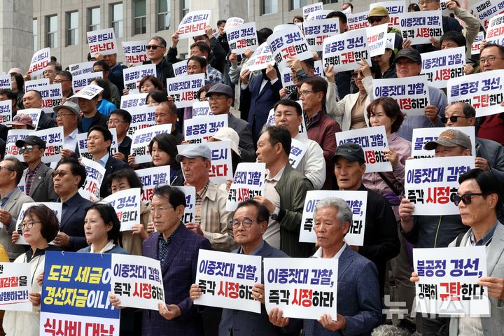 [서울=뉴시스] 조성봉 기자 = 17일 오전 서울 여의도 국회 본청 계단 앞에서 열린 '경선 식사비 대납 의혹 재감찰 촉구 전북도민 담화문 발표 기자회견'에서 참석자들이 손피켓을 들고 있다. 2026.04.17. [email protected]