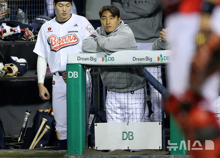 [서울=뉴시스] 이영환 기자 = 17일 오후 서울 송파구 잠실야구장에서 열린 2026 KBO리그 KIA 타이거즈와 두산 베어스의 경기, 4회말 두산 손아섭이 덕아웃에서 경기를 지켜보고 있다. 2026.04.17. [email protected]