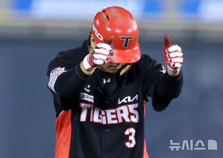 [서울=뉴시스] 이영환 기자 = 17일 오후 서울 송파구 잠실야구장에서 열린 2026 KBO리그 KIA 타이거즈와 두산 베어스의 경기, 7회초 1사 1,2루에서 KIA 김선빈이 2타점 2루타를 날린 후 세리머니를 하고 있다. 2026.04.17. [email protected]