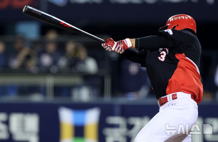 [서울=뉴시스] 이영환 기자 = 17일 오후 서울 송파구 잠실야구장에서 열린 2026 KBO리그 KIA 타이거즈와 두산 베어스의 경기, 7회초 1사 1,2루에서 KIA 김선빈이 2타점 2루타를 날리고 있다. 2026.04.17. [email protected]
