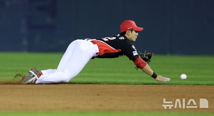 [서울=뉴시스] 이영환 기자 = 17일 오후 서울 송파구 잠실야구장에서 열린 2026 KBO리그 KIA 타이거즈와 두산 베어스의 경기, 8회말 1사 1루에서 KIA 2루수 정현창이 두산 김인태의 안타성 타구를 잡아내고 있다. 2026.04.17. [email protected]