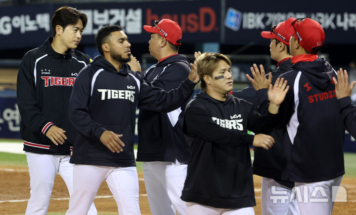[서울=뉴시스] 이영환 기자 = 17일 오후 서울 송파구 잠실야구장에서 열린 2026 KBO리그 KIA 타이거즈와 두산 베어스의 경기, 7-3으로 승리한 KIA 이범호 감독이 선수들을 격려하고 있다. 2026.04.17. [email protected]
