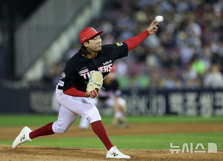[서울=뉴시스] 이영환 기자 = 17일 오후 서울 송파구 잠실야구장에서 열린 2026 KBO리그 KIA 타이거즈와 두산 베어스의 경기, 9회말 마운드에 오른 KIA 김범수가 공을 던지고 있다. 2026.04.17. [email protected]