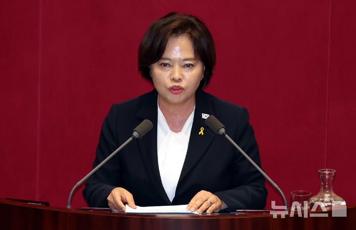[서울=뉴시스] 조성봉 기자 = 정춘생 조국혁신당 의원이 18일 오전 서울 여의도 국회에서 열린 제434회국회(임시회) 제6차 본회의에서 정치관계법 관련 법안들에 대해 반대 토론을 하고 있다. 2026.04.18. [email protected]
