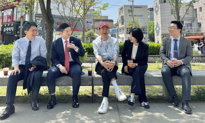 [서울=뉴시스] 홍효식 기자 = 국민의힘 서울시장 후보로 확정된 오세훈 서울시장이 18일 오후 서울 마포구 연트럴파크에서 배현진 서울시당위원장, 김재섭 의원 등 청년 정치인들과 오찬한 뒤 티타임을 갖고 있다. (사진=서울시 제공) 2026.04.18. [email protected] *재판매 및 DB 금지