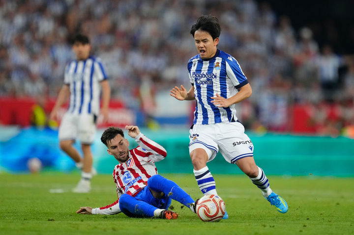 [세비야=AP/뉴시스] 레알 소시에다드의 쿠보 다케후사(오른쪽)가 18일(현지 시간) 스페인 세비야의 에스타디오 라 카르투하 데 세비야에서 열린 2025-26 스페인 코파 델 레이(국왕컵) 결승 아틀레티코 마드리드와 경기 중 공을 다투고 있다. 레알 소시에다드는 2-2 무승부를 기록해 승부차기 끝에 4-3으로 승리하고 우승컵을 들어 올렸다. 2026.04.19.