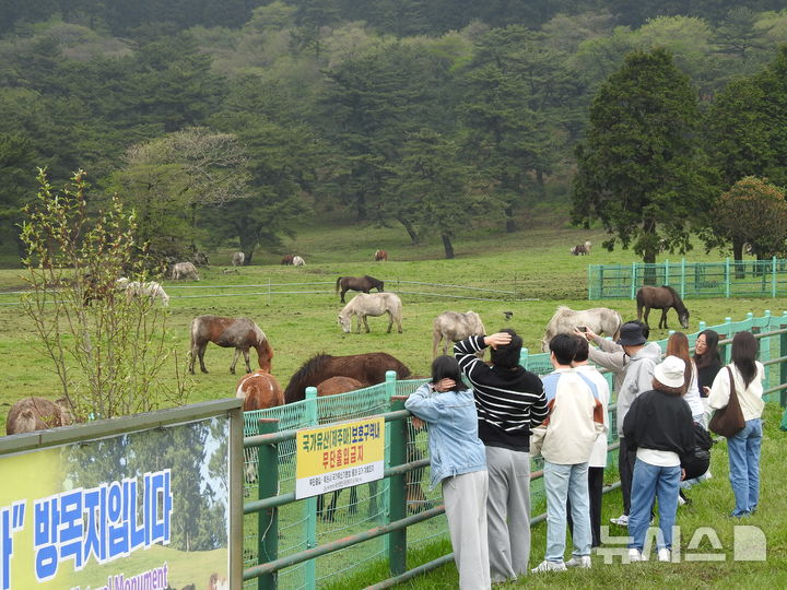 [제주=뉴시스] 김수환 기자 = 19일 오후 제주마 방목지에서 방문객들이 천연기념물 제347호 제주마를 바라보며 아쉬움을 달래고 있다. 당초 이날 '히잉 페스티벌' 일환으로 100여마리의 제주마가 초원으로 달려 나가는 입목(入牧) 퍼포먼스가 펼쳐질 예정이었지만 전날 예보된 산간 비 소식으로 행사가 취소됐다. 2026.04.19. [email protected]