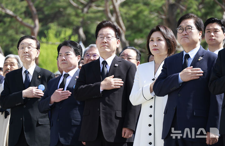 [서울=뉴시스] 최동준 기자 = 이재명 대통령과 김혜경 여사가 19일 서울 강북구 국립4·19민주묘지에서 열린 제66주년 4·19 혁명 기념식에서 국민의례를 하고 있다. 2026.04.19. [email protected]
