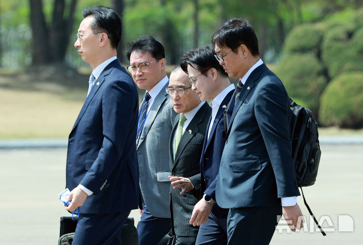 [성남=뉴시스] 고범준 기자 = 위성락(왼쪽 세번째) 국가안보실장과 김정관(왼쪽 네번째) 산업통상부 장관이 19일 경기 성남 서울공항에서 공군1호기로 향하며 대화하고 있다. 2026.04.19. [email protected]