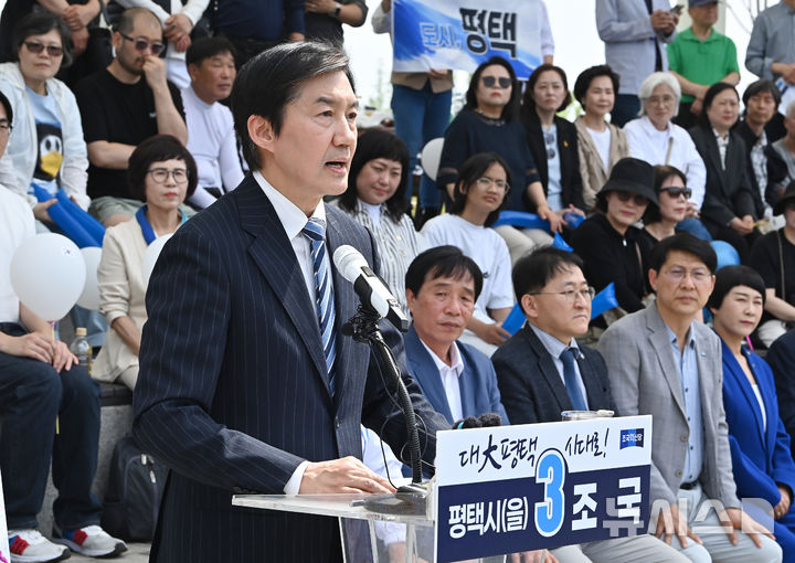 [평택=뉴시스] 김종택기자 = 조국 조국혁신당 대표가 19일 경기 평택시 고덕동 함박산 중앙공원에서 6·3 평택을 국회의원 재선거 출마 기자회견을 하고 있다. 2026.04.19. [email protected]