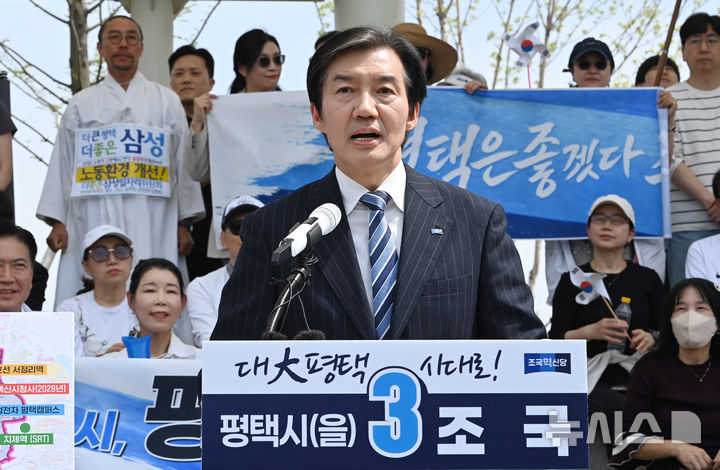 [평택=뉴시스] 김종택기자 = 조국 조국혁신당 대표가 19일 경기 평택시 고덕동 함박산 중앙공원에서 6·3 평택을 국회의원 재선거 출마 기자회견을 하고 있다. 2026.04.19. [email protected]