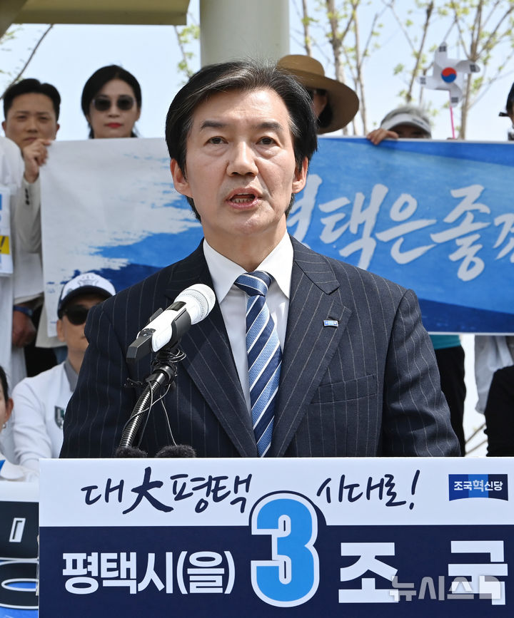 [평택=뉴시스] 김종택기자 = 조국 조국혁신당 대표가 19일 경기 평택시 고덕동 함박산 중앙공원에서 6·3 평택을 국회의원 재선거 출마 기자회견을 하고 있다. 2026.04.19. [email protected]