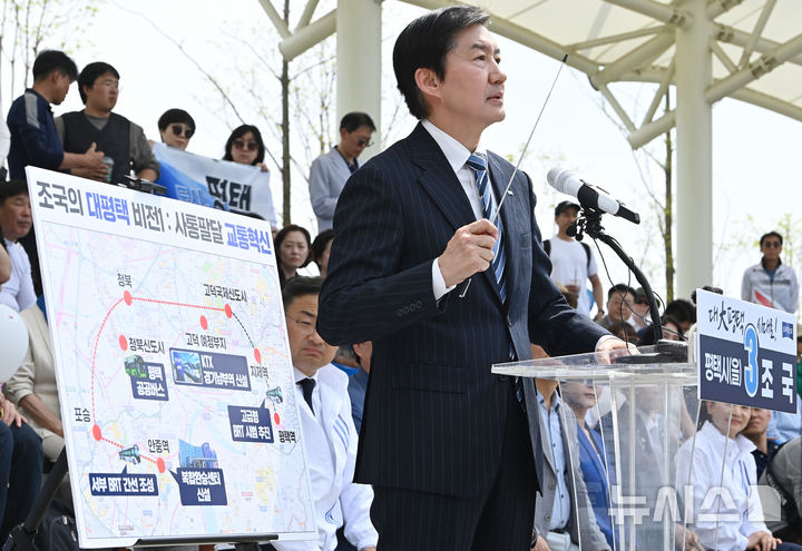 [평택=뉴시스] 김종택기자 = 조국 조국혁신당 대표가 19일 경기 평택시 고덕동 함박산 중앙공원에서 6·3 평택을 국회의원 재선거 출마 기자회견을 하고 있다. 2026.04.19. [email protected]