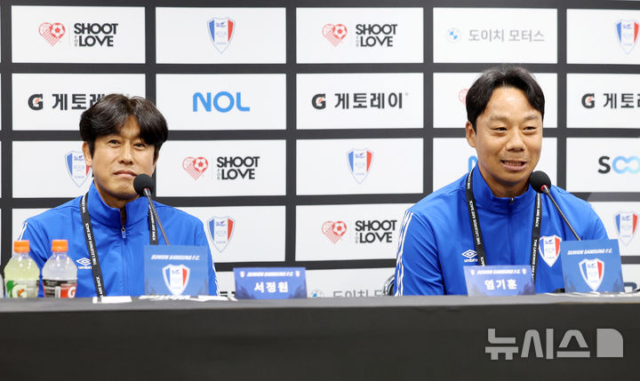 [수원=뉴시스] 조성우 기자 = 19일 수원월드컵경기장에서 OGFC(더 오리지널 FC) 대 K리그2 수원삼성 레전드의 경기 전 열린 기자회견에서 수원삼성 염기훈(오른쪽)이 소감을 밝히고 있다. 왼쪽은 서정원.