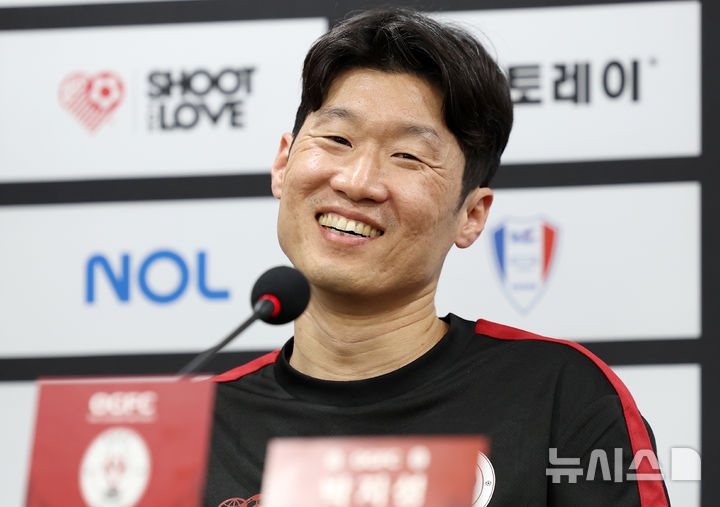 [수원=뉴시스] 조성우 기자 = 19일 수원월드컵경기장에서 OGFC(더 오리지널 FC) 대 K리그2 수원삼성 레전드의 경기 전 열린 기자회견에서 OGFC 박지성이 소감을 말하며 미소짓고 있다.