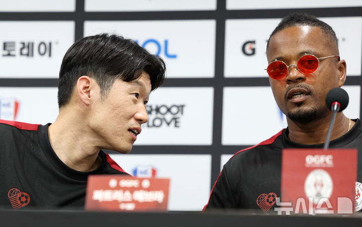 [수원=뉴시스] 조성우 기자 = 19일 수원월드컵경기장에서 OGFC(더 오리지널 FC) 대 K리그2 수원삼성 레전드의 경기 전 열린 기자회견에서 OGFC 박지성(왼쪽)과 파트리스 에브라가 대화하고 있다.