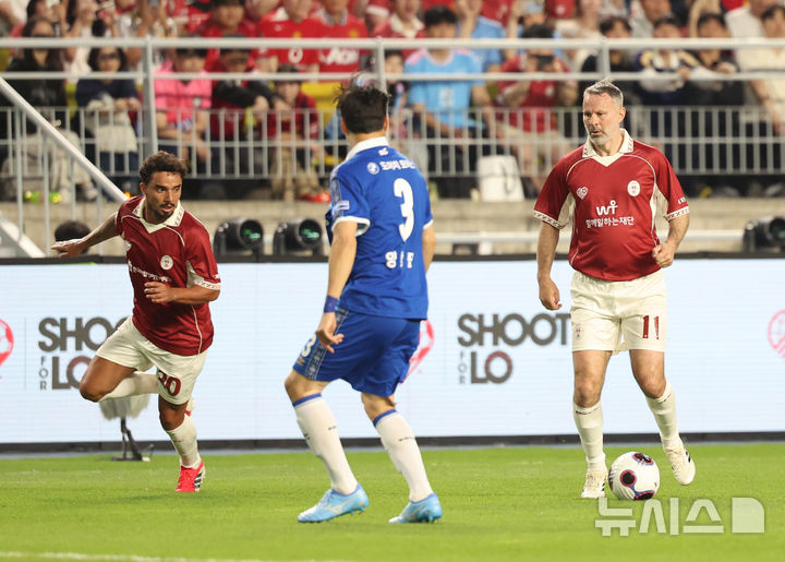 [수원=뉴시스] 조성우 기자 = 19일 경기 수원시 팔달구 수원월드컵경기장에서 열린 OGFC(더 오리지널 FC) 대 K리그2 수원삼성 레전드의 경기, OGFC 라이언 긱스가 돌파할 곳을 찾고 있다.
