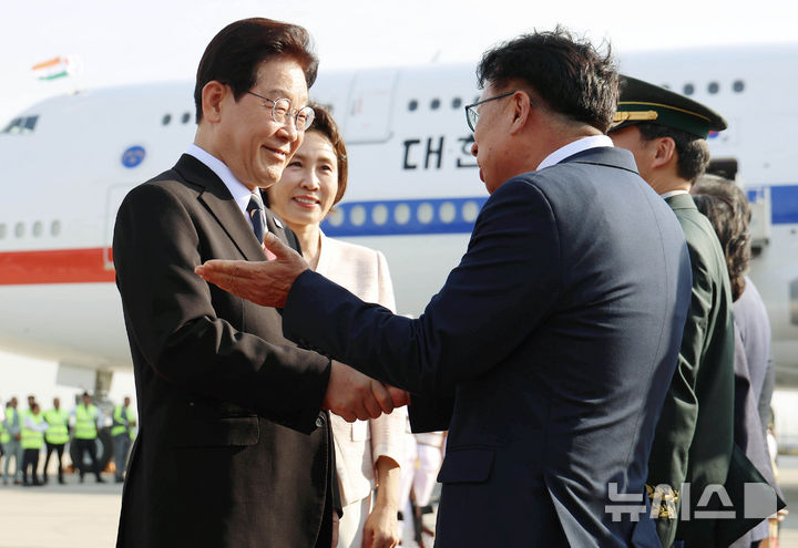 [뉴델리=뉴시스] 고범준 기자 = 인도를 국빈 방문한 이재명 대통령이 19일(현지 시간) 인도 팔람 공군공항에 도착해 환영 인사들과 인사하고 있다. 2026.04.19. [email protected]