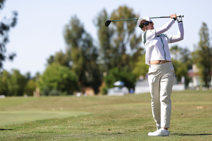 [로스앤젤레스=AP/뉴시스] 임진희가 19일(현지 시간) 미 캘리포니아주 로스앤젤레스 엘 카바예로 컨트리클럽에서 열린 미국여자프로골프(LPGA) 투어 JM 이글 LA 챔피언십 최종 라운드 10번 홀 러프에서 샷하고 있다. 임진희는 최종 합계 17언더파 271타로 김세영, 해나 그린(호주)과 동타를 이뤄 연장 끝에 그린에게 우승을 내주며 공동 2위로 대회를 마쳤다. 2026.04.20.