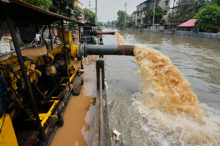 [구와하티=AP/뉴시스] 20일(현지 시간) 인도 구와하티에서 폭우로 침수가 발생해 모터 펌프를 이용해 침수 지역 물을 하천으로 빼내는 동안 시청 소속 근로자(왼쪽)가 배수구를 청소하고 있다. 2026.04.20.