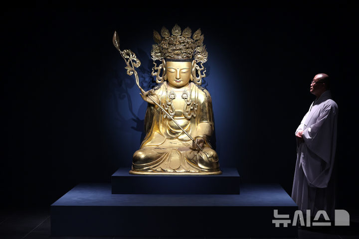 [서울=뉴시스] 박진희 기자 = 불교중앙박물관장 서봉 스님이 20일 서울 종로구 불교중앙박물관 전시실에 대한불교조계종 불교중앙박물관·선운사 특별전 '도솔산 선운사-선禪에 들고 구름에 눕다' 전시 유물인 개암사 '목조보살좌상'을 살펴보고 있다. 이번 전시는 전북 고창 선운사를 대표하는 지장보살(地藏菩薩)상 3점을 한 자리에서 최초 공개하며, 전북 지역의 주요 불교 문화유산을 소개하는 전시다. 2026.04.20. [email protected]