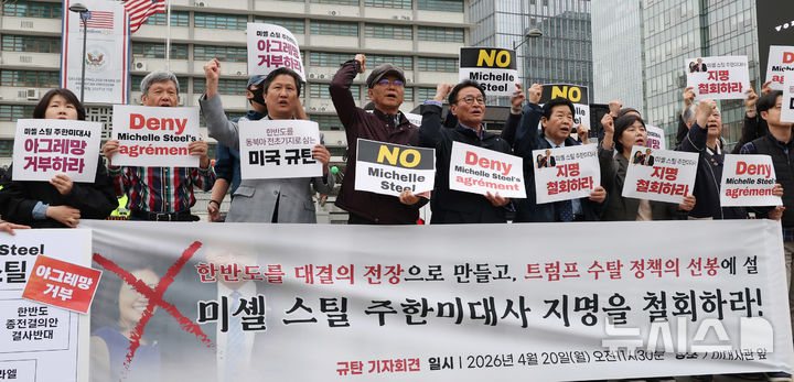 [서울=뉴시스] 추상철 기자 = 트럼프위협저지공동행동 등 단체가 20일 오전 서울 종로구 주한미국대사관 앞에서 미셸 스틸 주한미대사 지명 철회 기자회견을 하고 있다. 2026.04.20. [email protected]